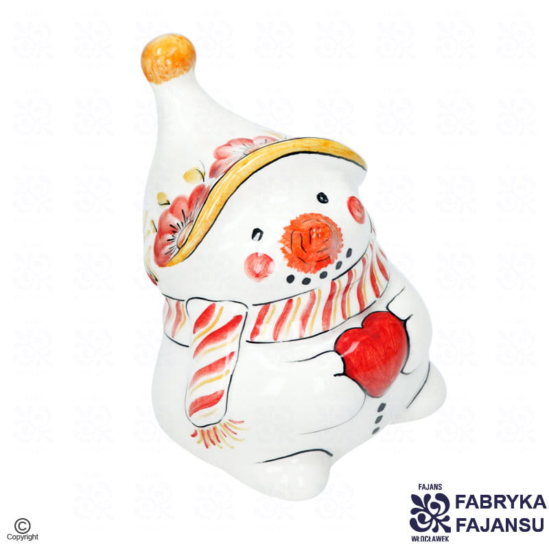 Figurka Bałwanek H 12 Figurka przedstawia małego bałwanka z marchewkowym nosem. Ubrany jest w kwiecistą czapę, szyję zdobi mu ciepły szal. W rękach trzyma serce, co dodaje mu jeszcze więcej uroku.