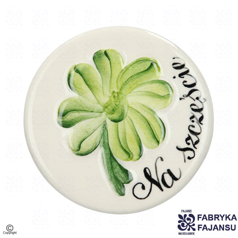 W sąsiedztwie koniczynki znajduje się napis "Na szczęście". Magnes Koniczynka Na szczęście Na rewersie umieszczone jest logo naszej Fabryki.