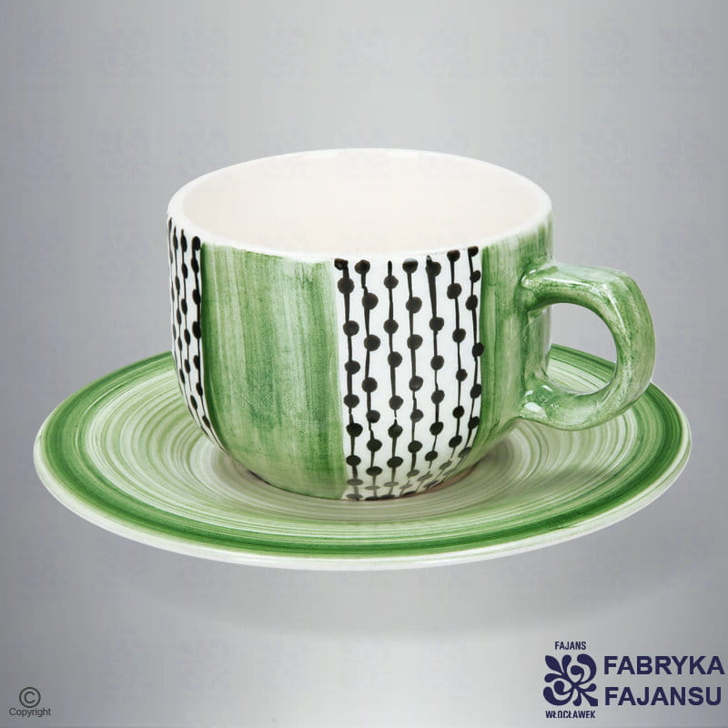 Filiżanka Ola 250 ml Grażyna Wzór filiżanki został zaprojektowany przez naszą malarkę Grażynkę. Niecodzienny design, który jest jednocześnie minimalistyczny i oryginalny. Przeważa tu kolor miętowy z elementami czerni. Do filiżanki dołączony jest spodek w miętowym kolorze.