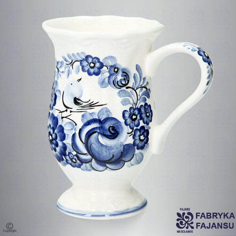 Kubek Dama Alicja Ptaszek Ozdobiony klasycznym, kwiatowym wzorem z motywem ptaszka w tradycyjnym, kobaltowym kolorze.